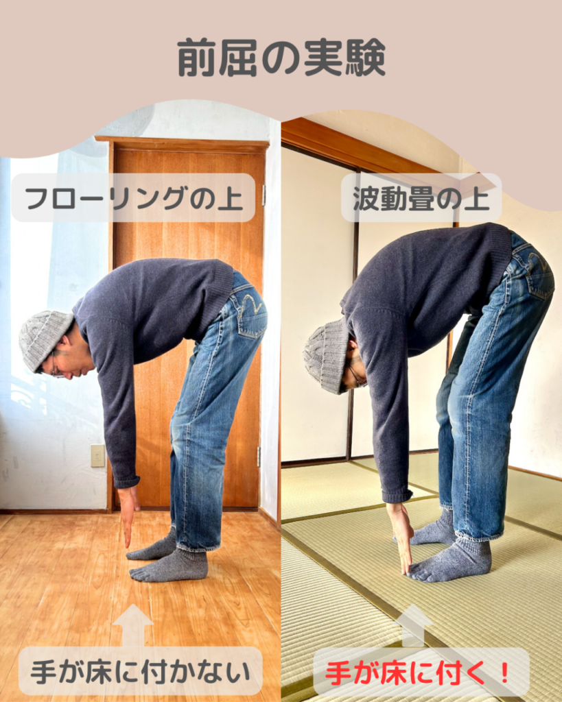 波動畳の上と、それ以外の場所(例えば、木製フローリングやフローリングシートの上)で前屈をしてもらって、どのくらい体が曲がるか比較してもらいます。