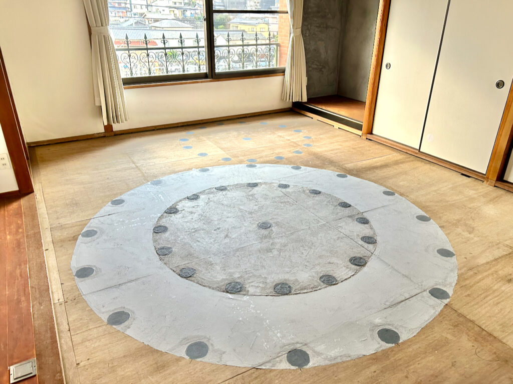 また畳下にも工夫を凝らし、好循環するエネルギーが伝わるように麻炭漆喰でサークルを描いております。